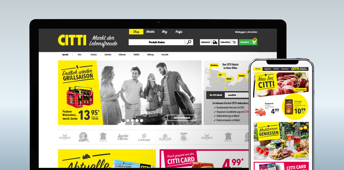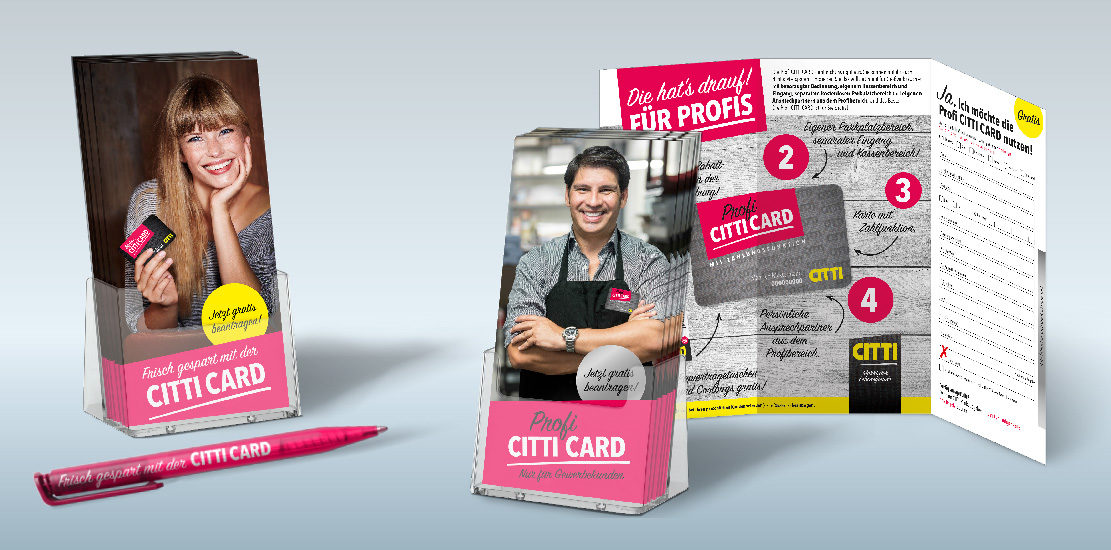 Für den CITTI Markt, der mit seinen 3 Märkten in Norddeutschland zu den größten Einzelhandelsunternehmen Deutschlands zählt, entwickelten wir ein neues Corporate Design rund um die Gestaltung im Markt. Der gesamte Markenrelaunch umfasste dabei alles vom Logo bis zur Visitenkarte, vom Auftritt am POS (Plakate, Ladeneinrichtung etc.) über die Imagekampagne bis zum neuen Look der Kundenkarte – der CITTI CARD.